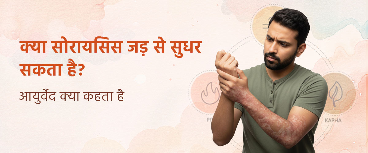आयुर्वेद के हिसाब से सोरायसिस मुख्य रूप से 'वात और पित्त दोष' के बिगड़ने तथा रक्त में 'आम' (टॉक्सिन्स) के जमा होने से जुड़ा होता है। जब खून दूषित हो जाता है और पेट साफ नहीं रहता, तो त्वचा पर खुजली, लाल चकत्ते, और पपड़ी जमने जैसी दिक्कतें शुरू हो जाती हैं। दोषों की पहचान आयुर्वेद में नाड़ी देखकर, चकत्तों की प्रकृति पर ध्यान देकर, और इंसान के विरुद्ध आहार (गलत खानपान) या तनाव के हिसाब से की जाती है। इलाज में वात-पित्त को संतुलित करना, हल्का और सुपाच्य खाना खाना, नीम-मंजिष्ठा जैसी जड़ी-बूटियाँ इस्तेमाल करना, शरीर का शोधन (पंचकर्म) और रोज़मर्रा की ठीक दिनचर्या अपनाना शामिल है।