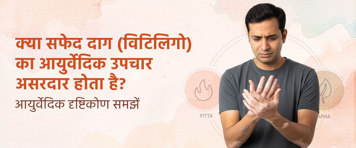 आयुर्वेद के हिसाब से सफेद दाग सिर्फ बाहरी त्वचा की दिक्कत नहीं है। आयुर्वेद में इसे 'श्वित्र' (Shvitra) या 'किलास' कहा जाता है। इसे कुष्ठ रोग की तरह छूत की बीमारी नहीं माना जाता, लेकिन इसके कारण शरीर के अंदर ही होते हैं। यहाँ यह माना जाता है कि जब विरुद्ध आहार और गलत जीवनशैली के कारण वात, पित्त और कफ तीनों दोष बिगड़ जाते हैं, तो वे रक्त (Blood), मांस (Muscle) और मेद (Fat) धातु को दूषित कर देते हैं। विशेष रूप से त्वचा में मौजूद 'भ्राजक पित्त' (जो त्वचा को रंग देता है) कमज़ोर पड़ जाता है। डॉक्टर नाड़ी, जीभ और दाग की जगह देखकर मर्ज़ को पकड़ते हैं। आयुर्वेद में बस रंग पोतना या स्टेरॉयड देना मकसद नहीं है, वो चाहते हैं कि बीमारी जड़ से ठीक हो, रक्त की गहरी शुद्धि हो, भ्राजक पित्त संतुलित हो और रोग प्रतिरोधक क्षमता प्राकृतिक रूप से सही काम करे।